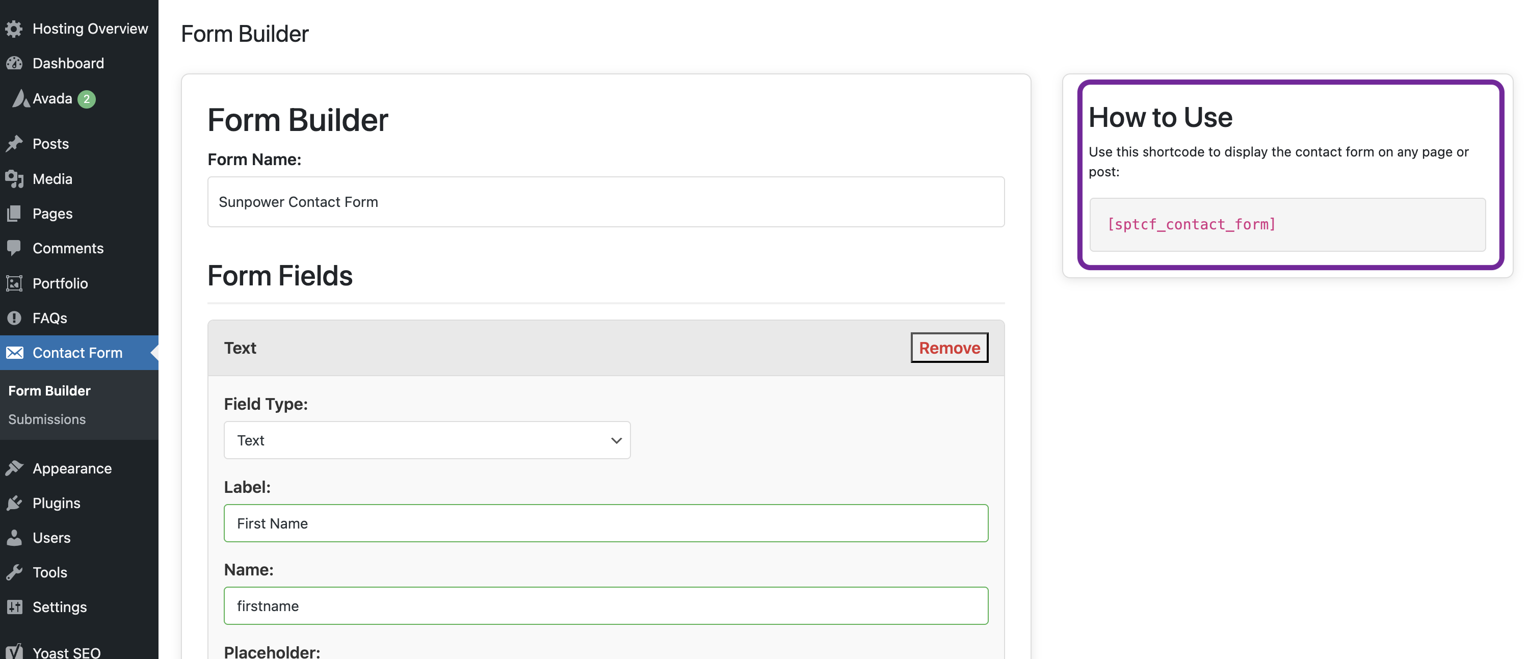 Once the plugin is installed, you can now configure the form for your needs. You can add as many form fields as you need. I highly recommend the following fields: first name, last name, email, phone number, and address. These are required to create a job in ServiceM8.