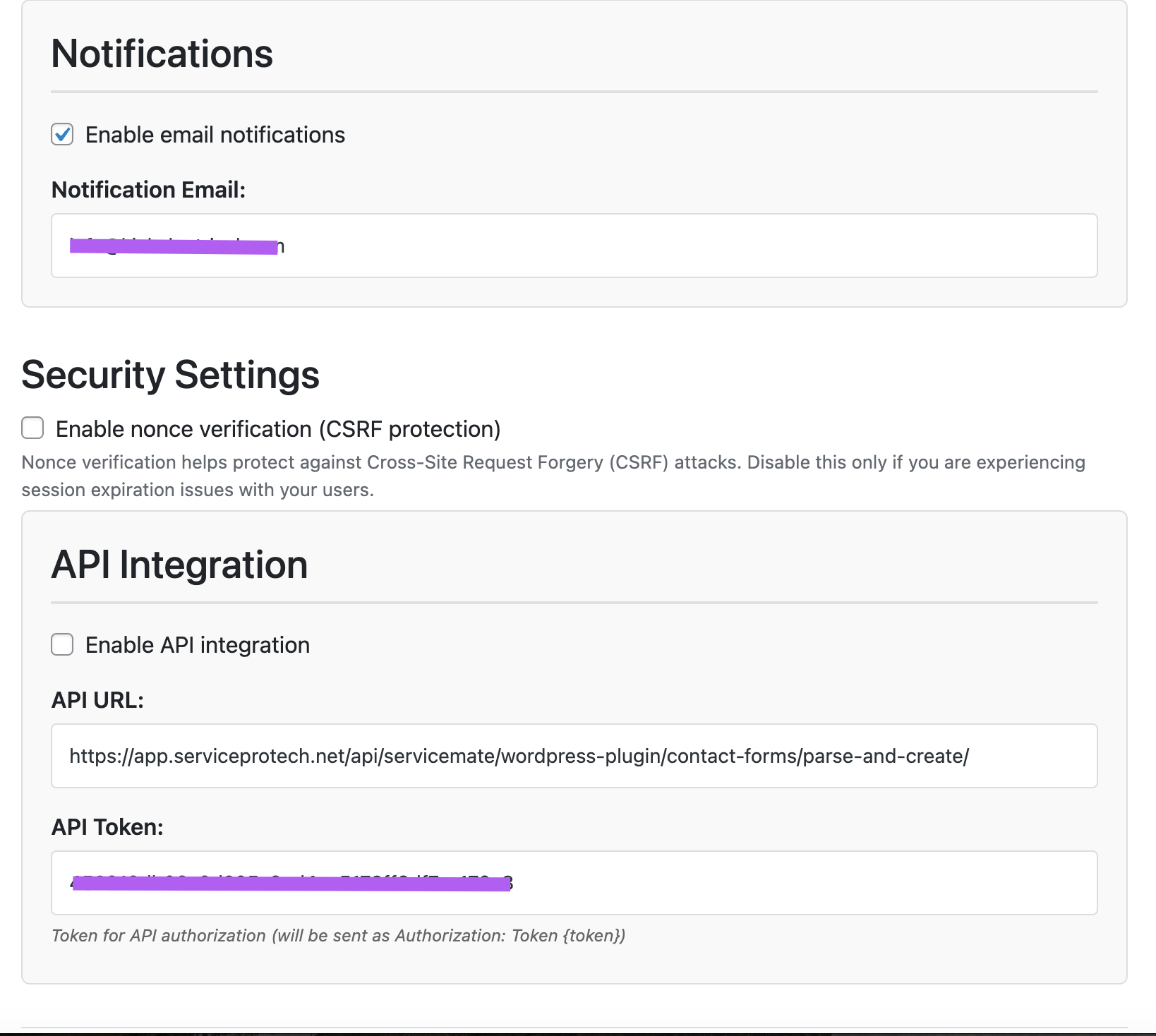 The last step of set up is to copy and past the API key and put it into the Wordpress plugin along with this API url - https://app.serviceprotech.net/api/servicemate/wordpress-plugin/contact-forms/parse-and-create/. If you check "Enable API Integration", then each form submission with result in a new job created.