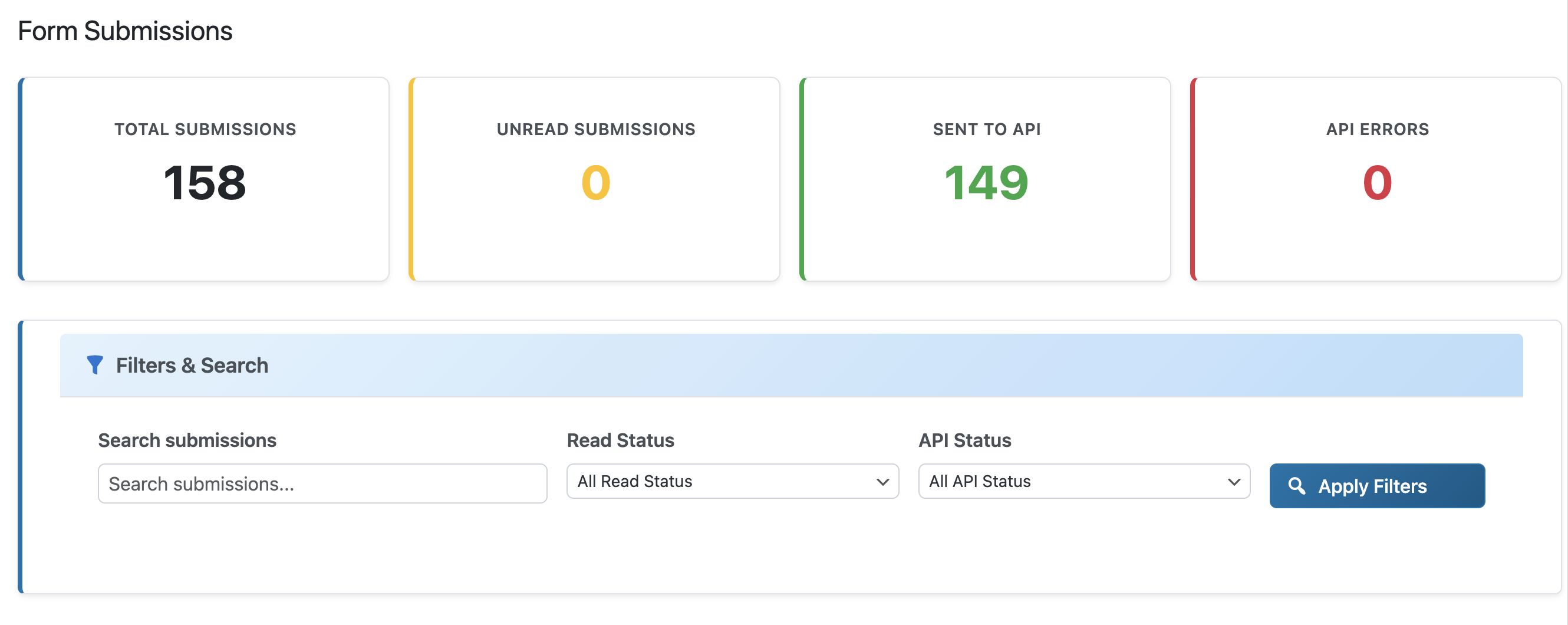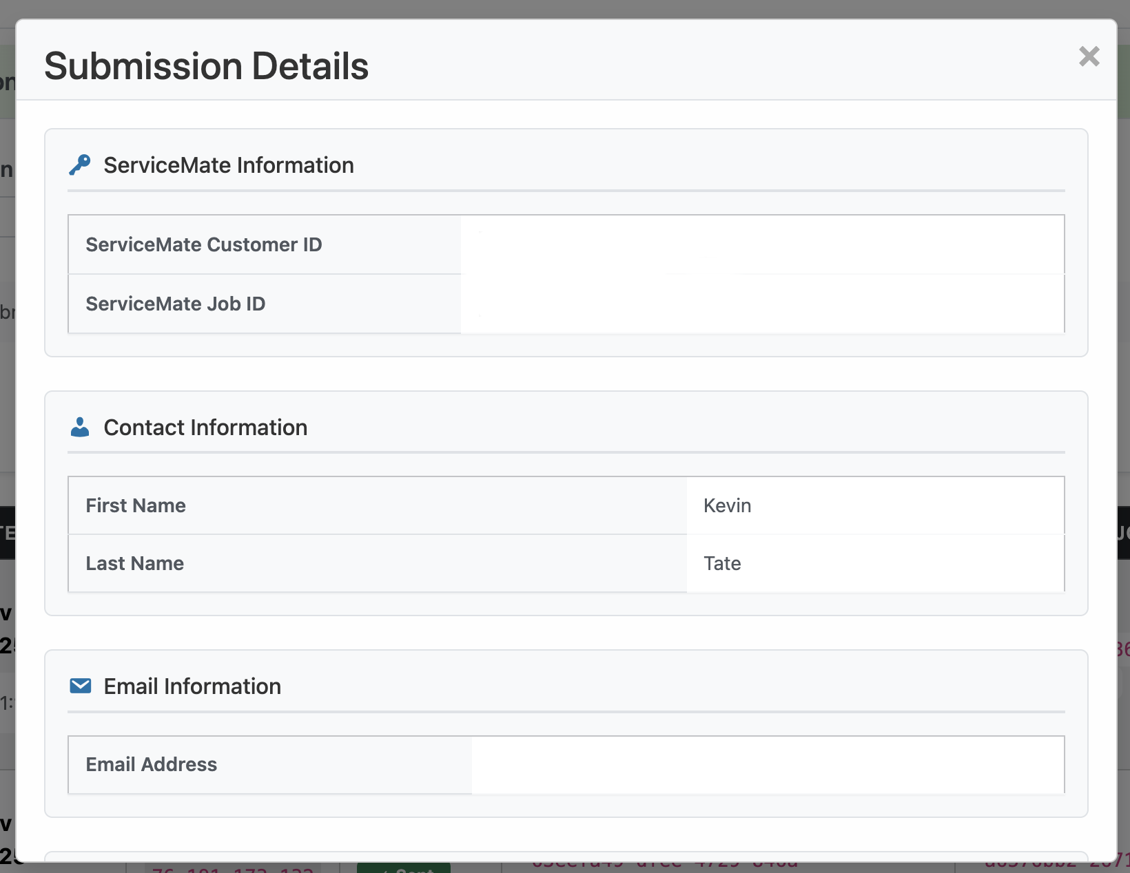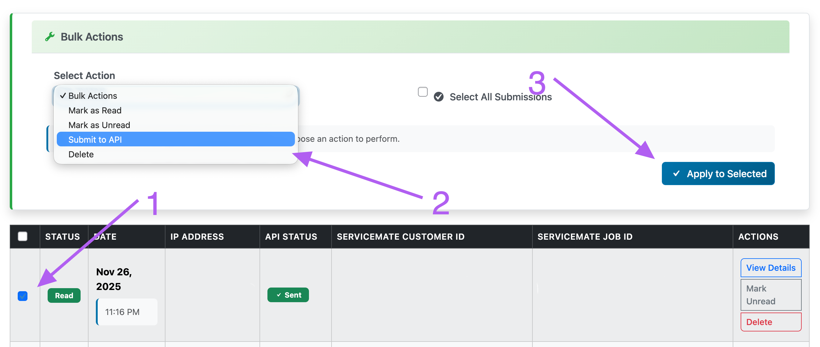 Once you're on the submissions page, you can see stats along with all the submissions. From here, you can select the ones you want to submit to ServiceM8.